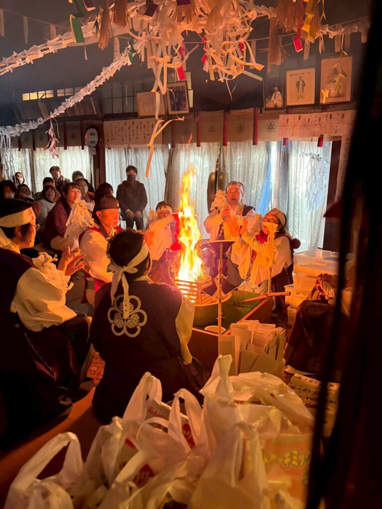 一体ずつ気合いを掛けながら焚き上げ、御神火は勢いよく上がり、教師と参拝者の祝詞の声が重なりあい、本殿は一体感でつつまれました。