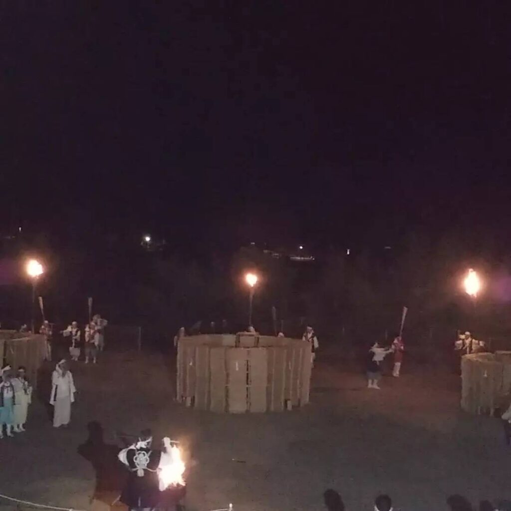 全国教会布教所から集まった数十万本の斎行を円柱に積み上げ、御嶽三柱を表す三つの輪を完成させ、午後8時に神事が始まり終盤、斎木に点火し三つ輪同時に焚き上げました。