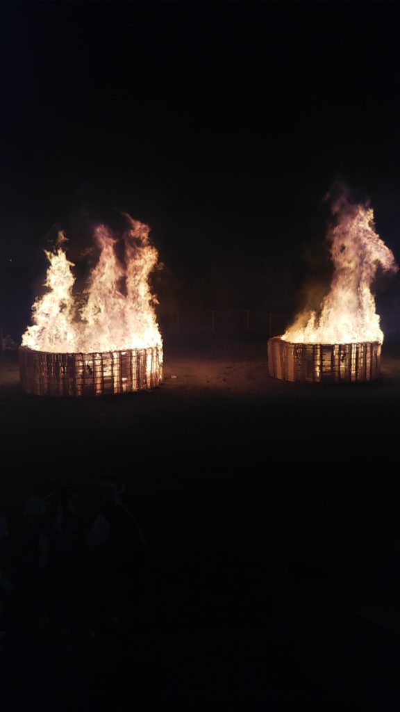 8月8日の午前1時に頂上御神火祭を八海山駐車場にて斎行し、午後8時より御嶽山木曽本宮で大御神火祭を斎行しました。今年で第68回を迎え、たくさんの斎木を井桁に円柱に積み上げ、三つの輪を作り宵の時間に全国でも数少ない大火祭りを行い、全国から大勢の信者達が集まり、一心に祈願しました。