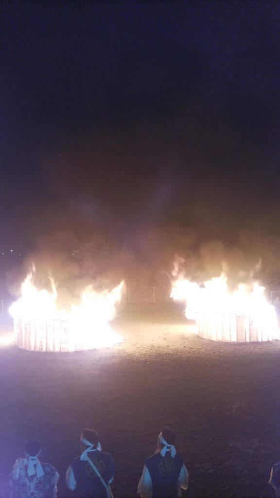 厳かな宵の時間に、御神火の炎は天高く舞い上がり、世界平和、疫病退散、国土安泰、諸々の熱誠の祈りを捧げました。今年は青年部奉仕団が担当し、無事に盛大に斎行され、御神火を次年度に継承しました。