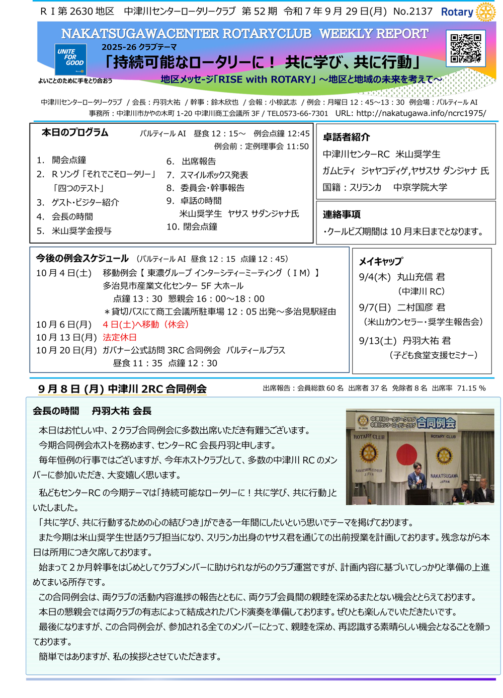 2025年9月29日Rotary Club Weekly Reportです。