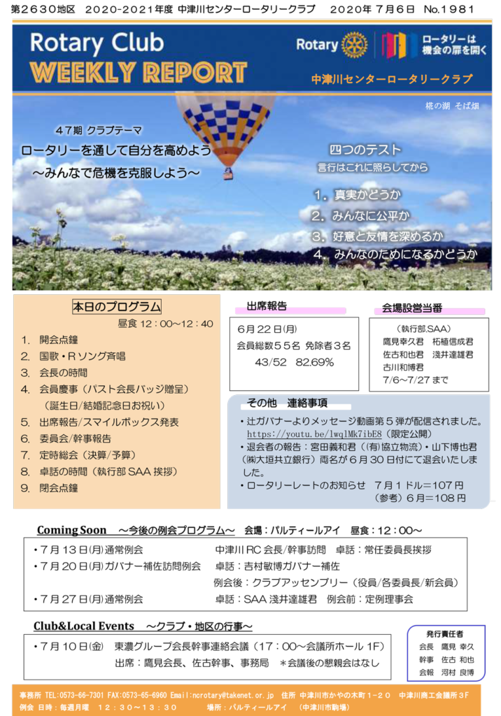 2020年7月6日 Rotary Club Weekly Reportです!