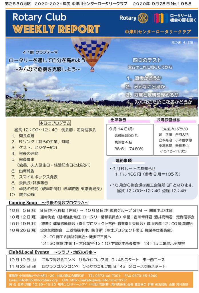 2020年9月28日 Rotary Club Weekly Reportです!