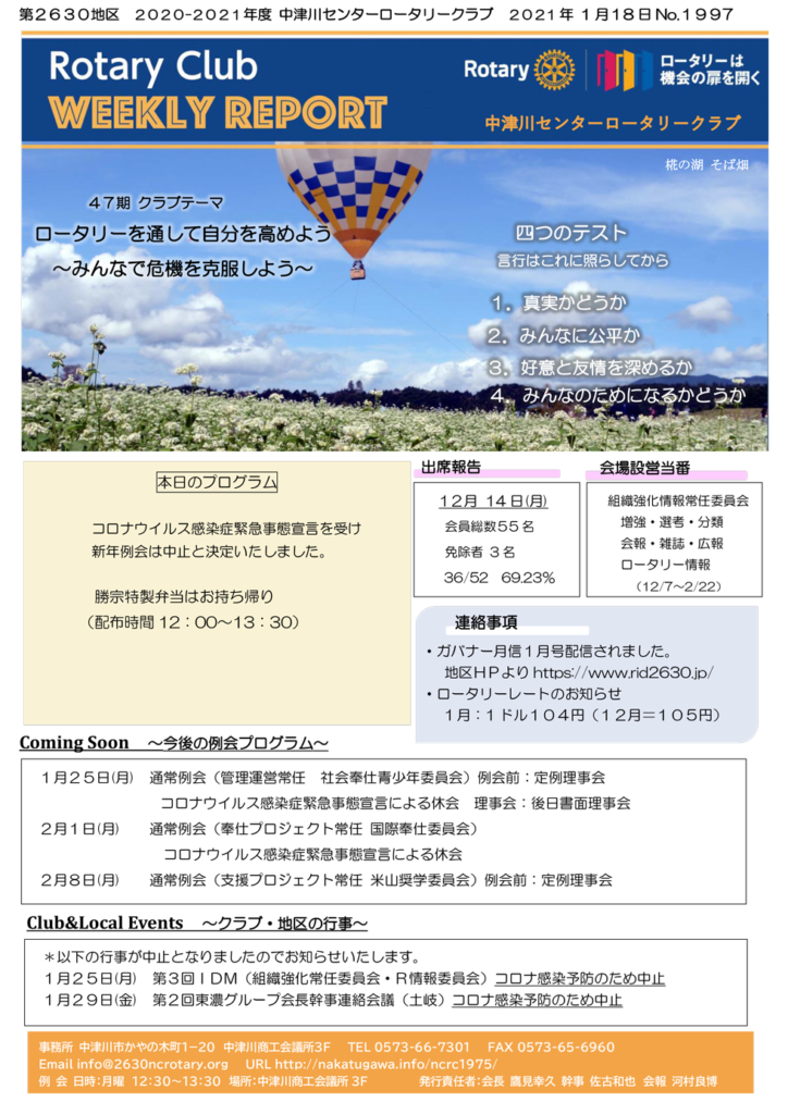 2021年1月18日 Rotary Club Weekly Reportです!