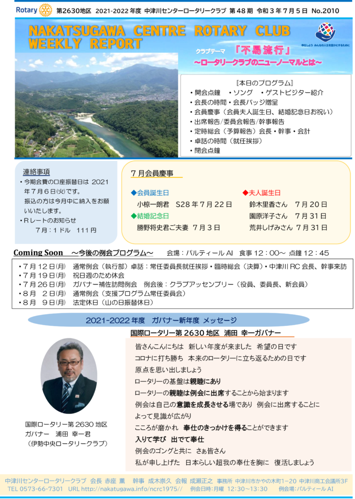2021年7月5日 Rotary Club Weekly Reportです。