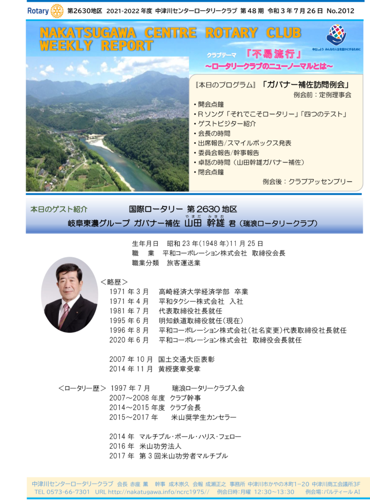 2021年7月26日 Rotary Club Weekly Reportです。