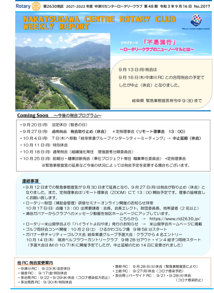 2021年9月16日 Rotary Club Weekly Reportです。