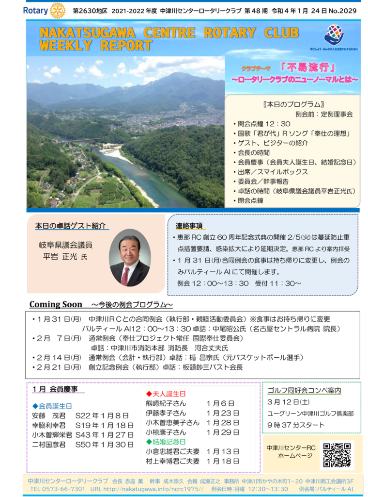 2022年1月24日Rotary Club Weekly Reportです。