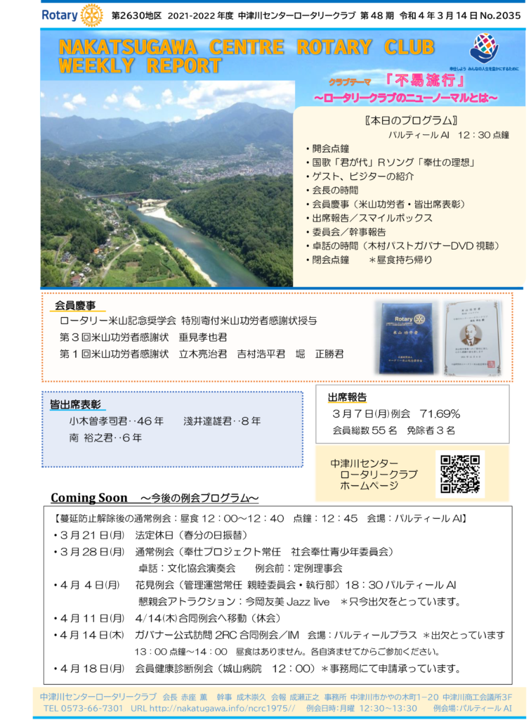 2022年3月14日Rotary Club Weekly Reportです。