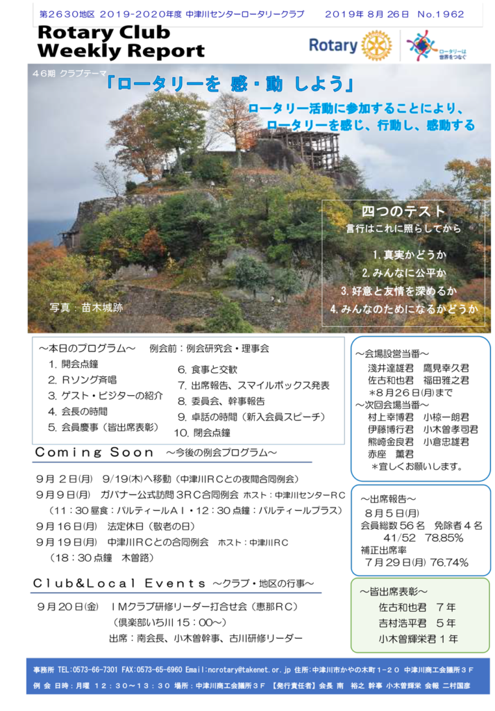 2019年8月26日Rotary Club Weekly Reportです。