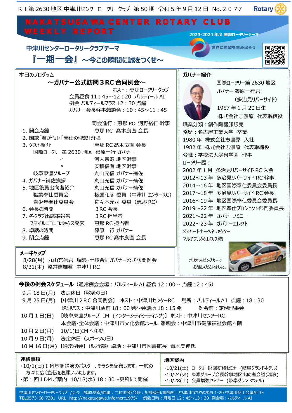 2023年9月12日Rotary Club Weekly Reportです。