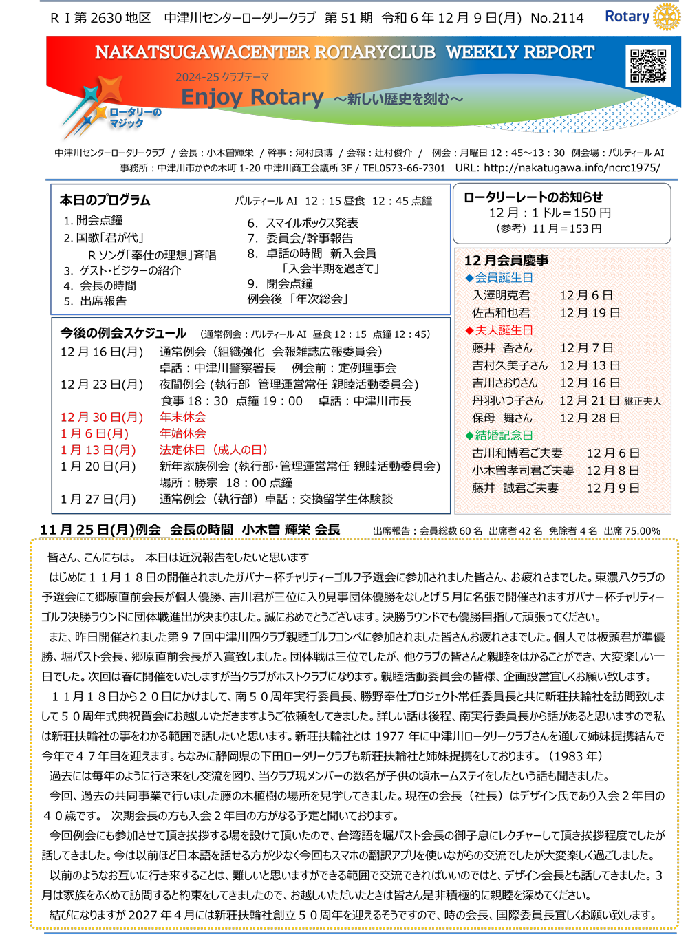 2024年12月9日Rotary Club Weekly Reportです。