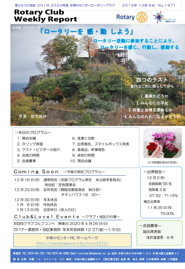 2019年12月9日Rotary Club Weekly Reportです。