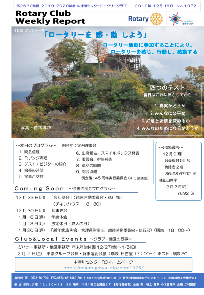 2019年12月16日Rotary Club Weekly Reportです。